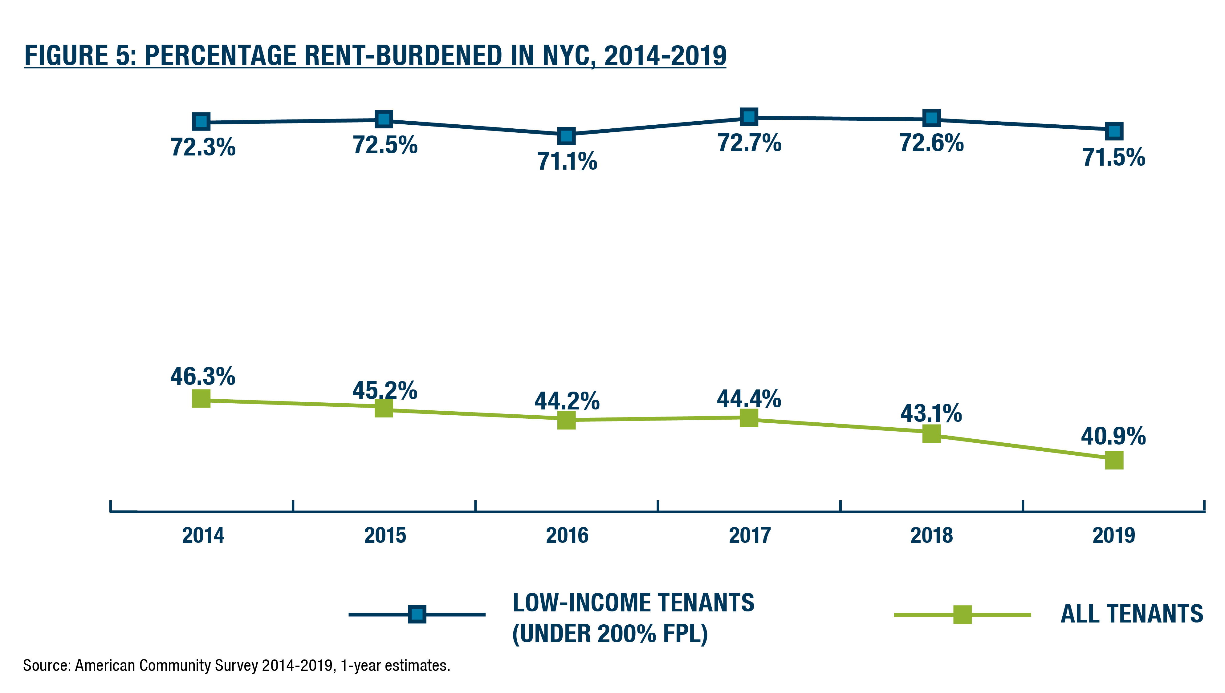 During the Bloomberg administration, the city crossed a dangerous precipice: between 2008 and 2011, housing prices became unaffordable to a majority of New York renters (as measured by the standard formula of one’s ability to pay under 30 percent of their income in rent). According to the 2017 Housing and Vacancy Survey, the most comprehensive survey of local housing dynamics, housing unaffordability did not abate under de Blasio.[9] The American Community Survey suggests a somewhat lower overall rent burden, but also highlights a crucial dynamic: while the percent of all tenants with rent burdens appeared to decrease, from 46 percent in 2014 to 41 percent in 2019 (approximately the same rate as 2008), the percent of low-income tenants (those under 200 percent of the Federal Poverty Line) with rent burdens remained much higher at 72 percent over the course of the de Blasio administration. In fact, during this time the percentage of low-income New Yorkers paying more than half of their income in rent rose by one percentage point.
