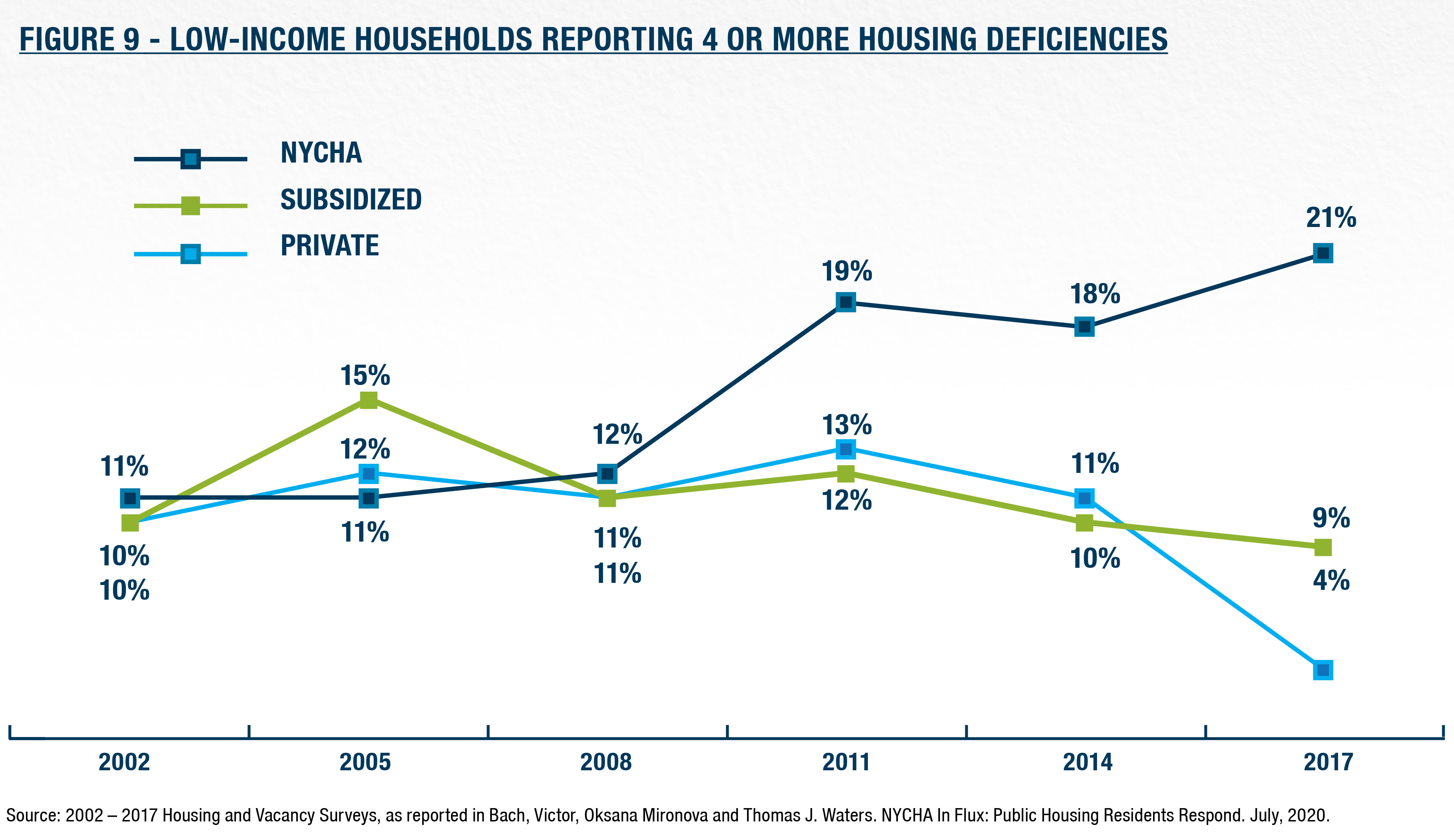 12. This trend is also visible in public housing tenants facing 3 or more deficiencies, a percentage that rose from 35% to 37% during the same time period. Bach, Victor, Oksana Mironova, and Tom Waters. NYCHA In Flux: Public Housing Residents Respond. Community Service Society. July, 2020.
