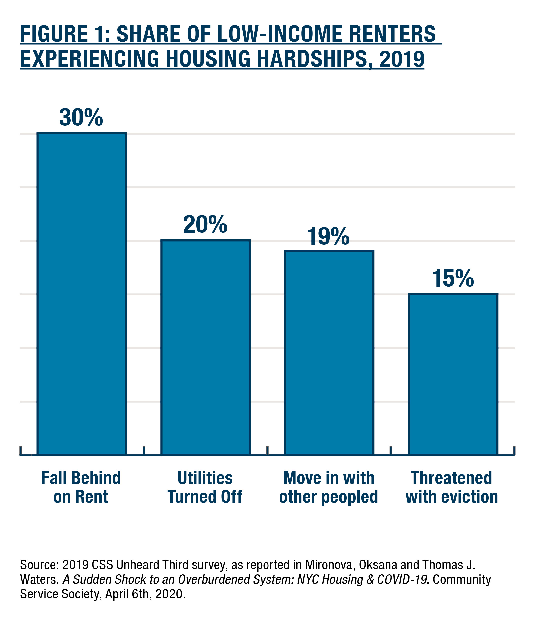 1. Mironova, Oksana and Thomas J. Waters. A Sudden Shock to an Overburdened System: NYC Housing & COVID-19. Community Service Society, April 6, 2020.
