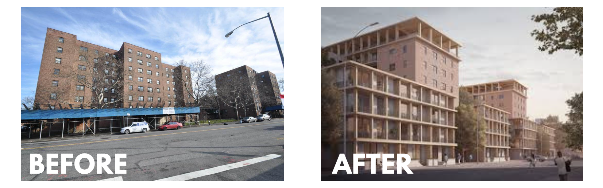 - Unlike past state public housing investments, the PHIX NY plan is self-sustaining. Meaning, that upon completion of the individual projects, the state will NEVER have to spend to upkeep the units. This plan doesn’t call for large infills or demolition of public housing, instead, scalable designs situated on the lower levels of the developments will produce brand new public housing units, provide revenues, and upgrades that can only be unlocked thanks to state investment. In 2020, architects serving as fellows in Regional Plan Association’s (RPA) Kaplan Chairs for Urban Design produced designs that replace outdated and centralized building mechanicals, added private outdoor spaces via balconies, and better integrating existing buildings within neighborhoods. The most striking and novel element of the proposal was the expansion of existing buildings into the unoccupied ground floor to develop additional units. New units extended the properties to sidewalks and streetside, finally integrating NYCHA with the rest of the city. Adding to this proposal, a mixture of household types can ensure that NYCHA properties remain well-maintained, recapitalizing the city’s greatest assets.
