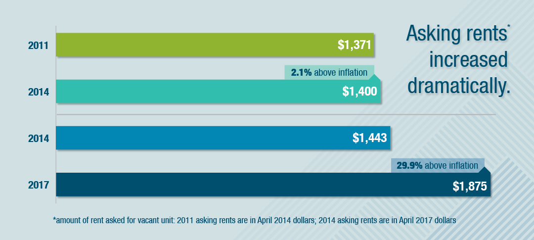 The most extreme indication of the skyrocketing rental market was in the asking rents (amount of rent asked for vacant unit), which increased from $1,443 in 2014 to $1,875 in 2017, 29.9 percent above inflation. For comparison, asking rents between 2011 and 2014 went up by 2.1 percent above inflation, from $1,371 to $1,400.