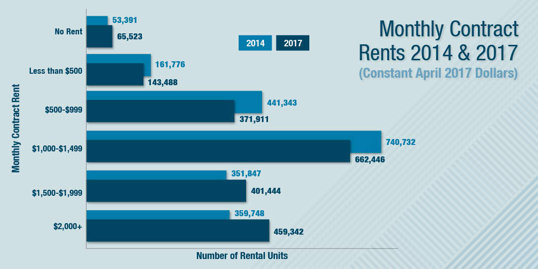 The number of apartments renting for over $2,000 increased by 99,594 units since 2014, while the number of apartments renting for under $1,000 decreased by 87,720 units. Apartments renting for over $2,000 make up a larger share (21.8 percent) of the overall rental market than they did in 2014 (17.1 percent).