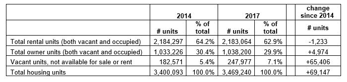 The overall vacancy rate in 2017 was 3.63 percent. There were 79,190 non-dilapidated vacant units available for rent. However, there was a vast difference in vacancy rates among different rental tiers. Apartments that cost over $2,000 have a 7.42 percent vacancy rate, while apartments under $800 have a 1.15 percent vacancy rate.