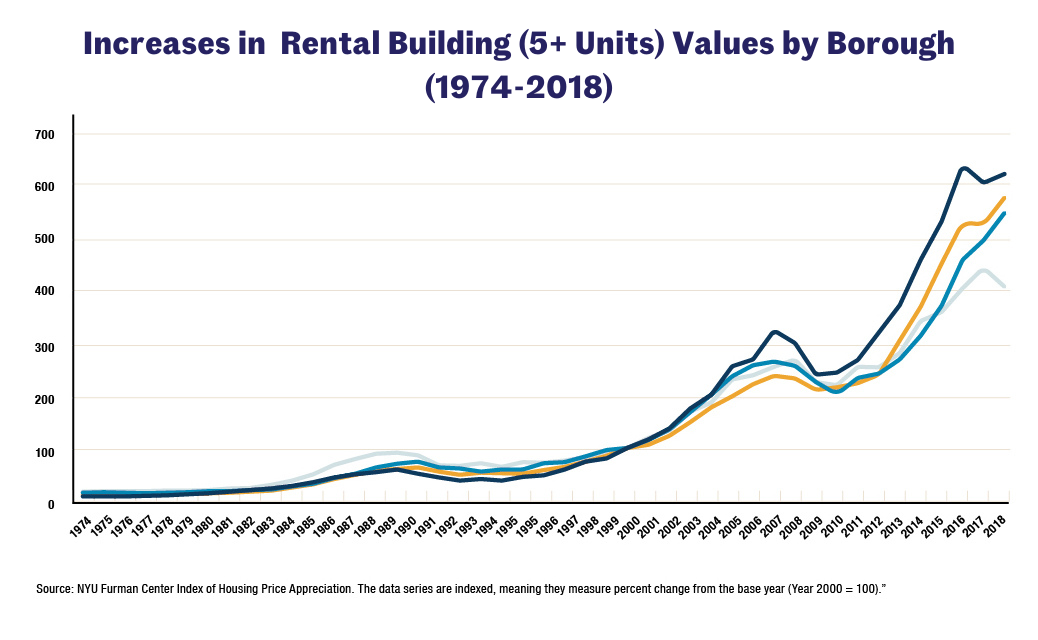 Rental building values have risen in two waves since the mid-1990s. The first wave occurred between 1995 and 2007, when the average annual rental building sales price in New York City increased by almost 400 percent in every borough except Staten Island. Between 2010 and 2018, median sales prices for rental buildings rose again, more than doubling in many neighborhoods.