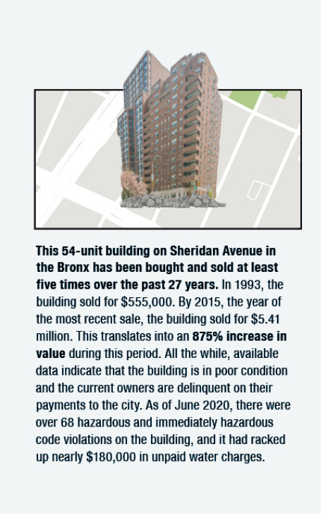 Selling a building for more than the purchase price is the most direct, but not the most common way landlords make money of their buildings in New York. Landlords generate major profits by increasing a building’s net operating income (NOI) by hiking up rents or by spending less money on operations. Both come at tenants’ expense: increasing rents displaces long-term tenants, while cutting operating expenditures creates disrepair.