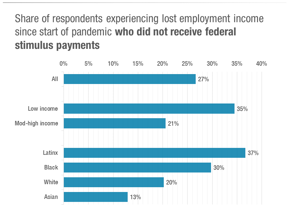 While a little over 70 percent of New Yorkers who lost employment income3 since the start of the pandemic said that they had received federal stimulus payments, 27 percent did not, and low-income New Yorkers were even less likely to receive these stimulus payments. Disturbingly, 35 percent of low-income New Yorkers did not receive financial relief, compared to 21 percent of those with moderate to higher incomes. Latinx and Black residents were the least likely to receive federal stimulus payments—37 percent of Latinx and 30 percent of Black New Yorkers did not get this relief, in contrast to only 20 percent of white residents. These findings are in line with recent research that found these disparities were likely due to not having a recent tax return on file, lack of internet access,4 and being unbanked. It is crucial to note that many people living below the federal poverty line are not required to file tax returns, and the unbanked population likely could not receive the stimulus because it was sent via direct deposit to a bank account. These factors made it more difficult, if not impossible for low-income New Yorkers to receive the stimulus. Other New Yorkers may also have been ineligible because they or their spouse were undocumented.5