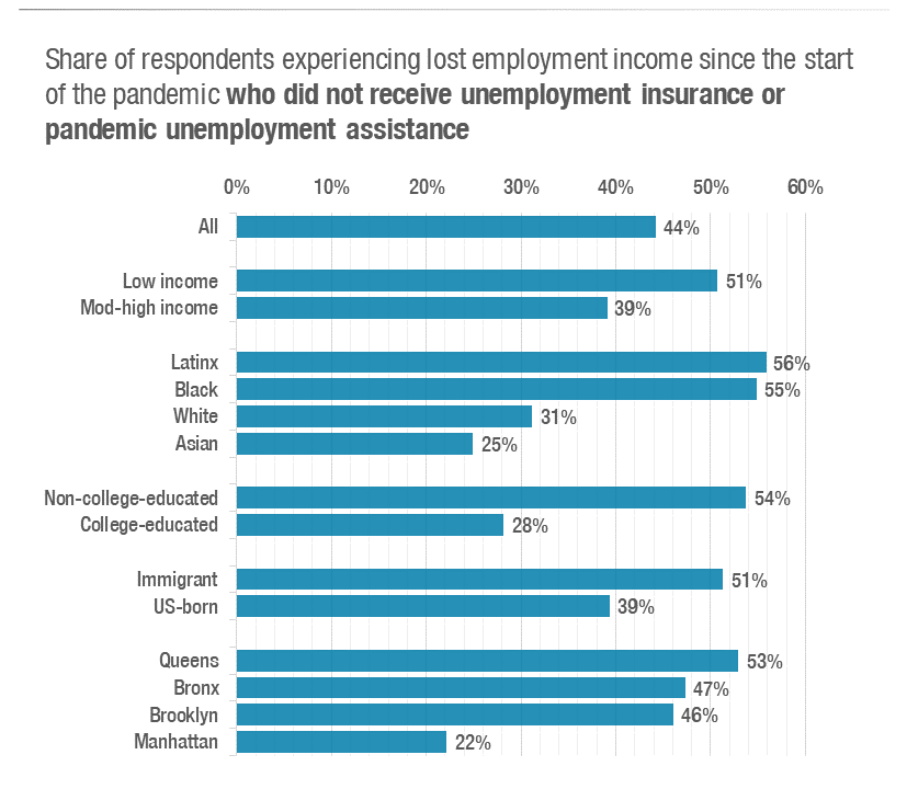 Government relief has failed to reach New Yorkers who have been hardest hit by COVID-19-related wage and job loss – especially Latinx and Black communities. Such inequitable distribution of relief has led to increased hardship for many low-income New Yorkers. Food and housing insecurity will only continue to grow if a compromise cannot be reached immediately on a new federal relief package that reaches those most in need. At the local level, we must continue to prioritize the expansion of programs such as Fair Fares and Right to Counsel that will help cushion the blow of the pandemic. At the state level, we must pass a genuine eviction moratorium that keeps people in their homes. The disparities in access to unemployment benefits among immigrant New Yorkers also illustrate the need to create a separate state-funded unemployment or wage replacement program to provide weekly payments to undocumented workers who don’t qualify for regular unemployment benefits.6 New York State should also modernize its unemployment insurance technology to make the system more user-friendly for low-wage workers and workers of color.