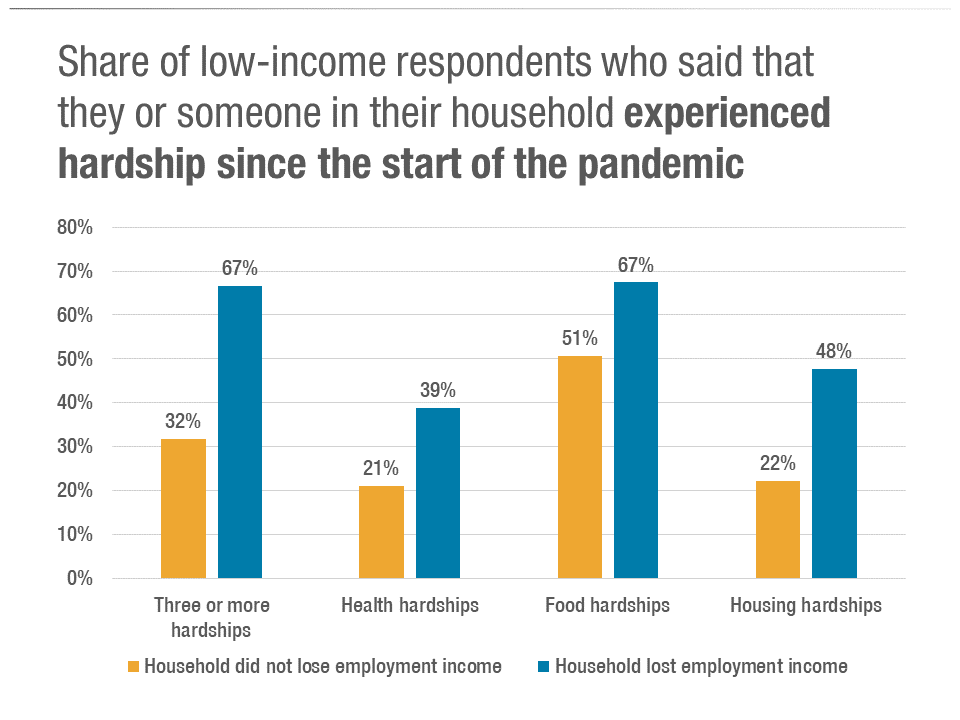 Low-income New Yorkers who lost employment income since the pandemic—either personally or in their household—are twice as likely to experience multiple hardships