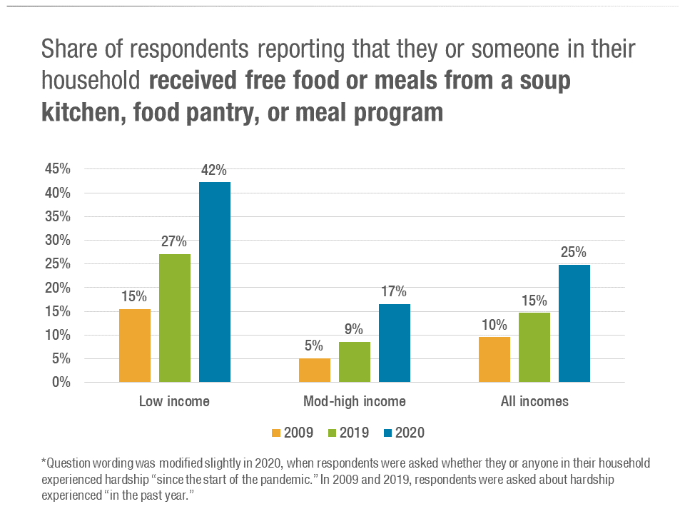 Food insecurity was the most common type of hardship among low-income New Yorkers who lost employment income in their household, with 67 percent reporting that they received free food or meals from a food pantry, family or friends, went hungry, or often skipped meals. Food insufficiency has spiked across incomes since the Great Recession: 42 percent of low-income New Yorkers and 17 percent of those with moderate to higher incomes said that they used a food pantry, soup kitchen, or meal program since the start of the pandemic, triple the rates in 2009.