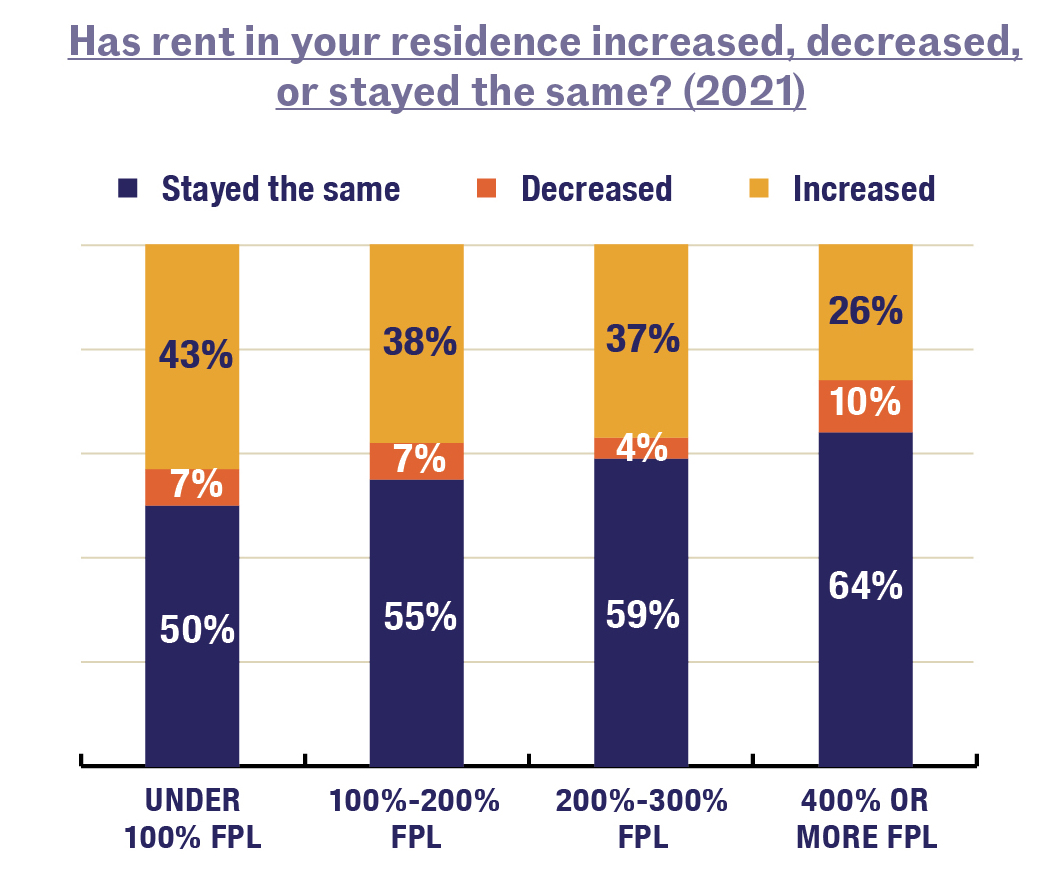 Even during the height of the pandemic, rents rose for many tenants. A plurality (43 percent) of tenants who earn less than the federal poverty line experienced rent increases over the past year, 17 points more than higher-income tenants.