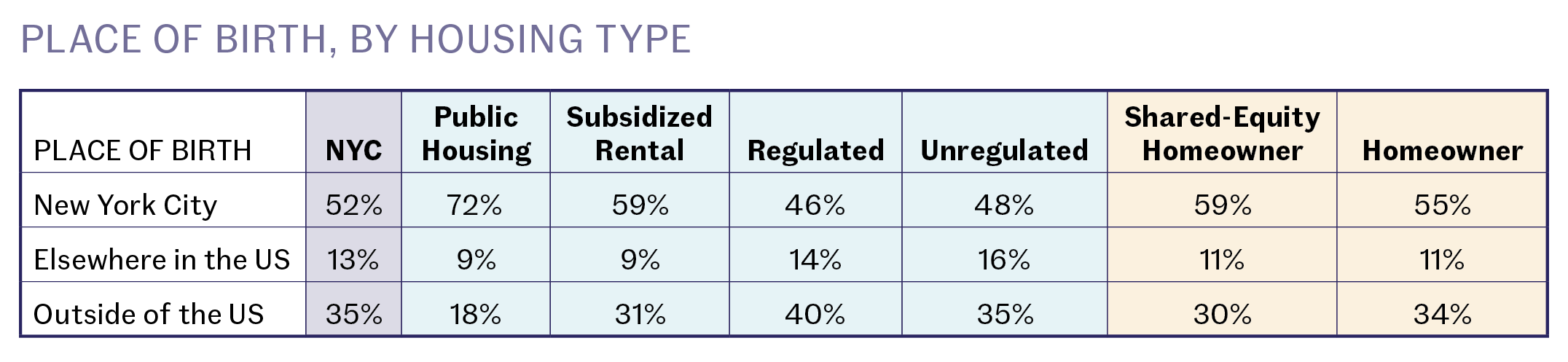 About one-third of New Yorkers were not born in the United States. Immigrants are underrepresented in public housing, making up only 18 percent of the residents, which is 17 percentage points lower than their share of the city’s overall population. This is likely a result of both NYCHA’s extremely long waiting lists and federal policies that make public housing more difficult to access for undocumented people. At the same time, 40 percent of regulated tenants are immigrants. While, on average, not as deeply affordable as government-assisted housing, rent regulation offers a level of stability and protection to all tenants because it is not a means-tested program.