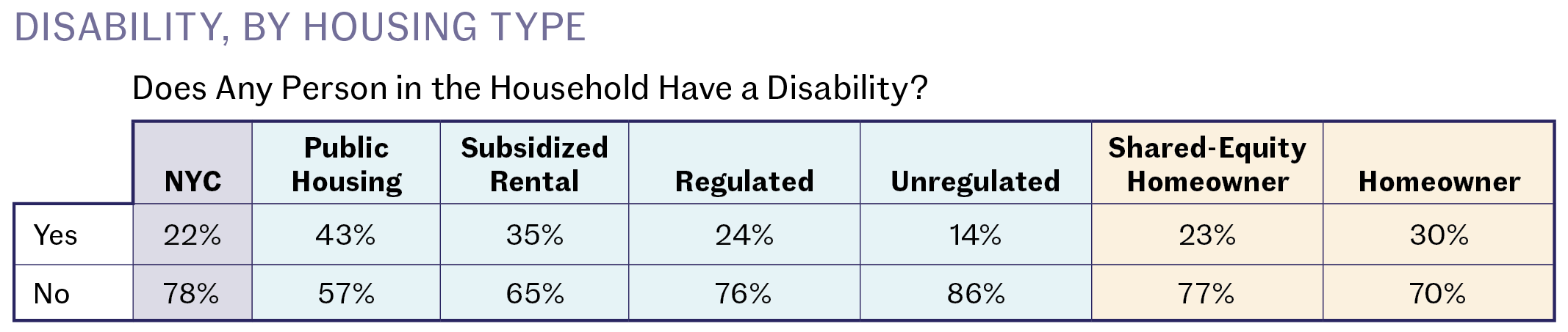 One in five households in New York City includes a person living with a disability, which (within the HVS definition) can include people with hearing and sight limitations, memory disorders, or people who have difficulty walking and running everyday errands on their own. People with disabilities are over-represented in public and subsidized housing. Forty-three percent of households in public housing include a person with disability, 21 points above their representation in the city overall. Thirty-five percent of subsidized households include a disabled person, 13 percent above the city’s overall share.