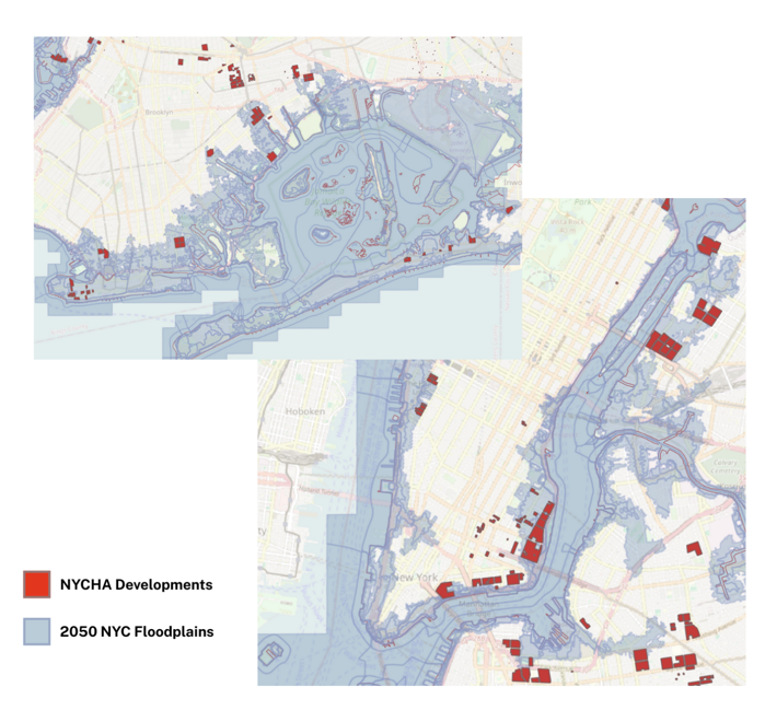 Although flooding is a concern across southern Manhattan, public housing developments are especially vulnerable due to disparities in infrastructure investment and available services. This pattern extends to NYCHA developments across the city. Click here to view an overlay of NYCHA developments and floodplains.