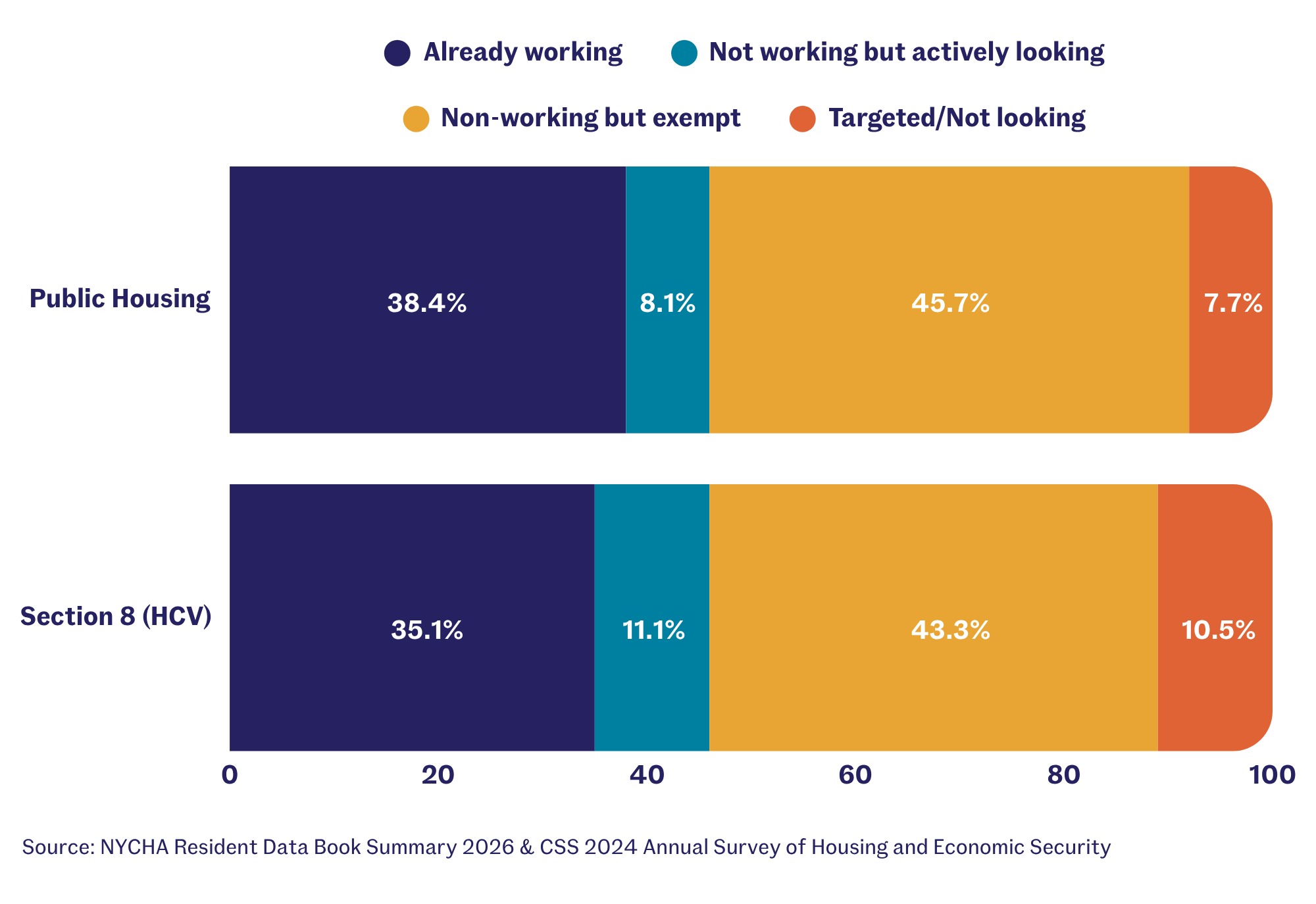The numbers do not justify strict work requirements. Across the roughly 143,000 Public Housing and Section 8 households in NYCHA, nearly 55,000 already contain at least one working adult. Once explicitly exempt populations—such as seniors, individuals with disabilities, caregivers for young children, and enrolled students—are factored in, the pool of non-working, non-exempt adults plummets.