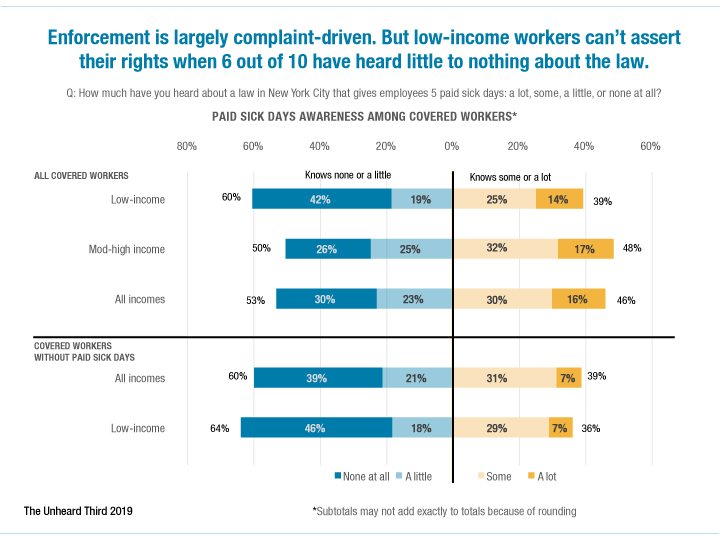 Enforcement of the paid sick leave law is largely complaint-driven. But workers are unable to assert their right to paid sick time if they are unaware of the law. That’s why awareness matters. In 2019, 60 percent of low-income workers covered by the New York City law had heard little or nothing about it and nearly two-thirds of covered workers without paid sick time were unaware of their right to it.