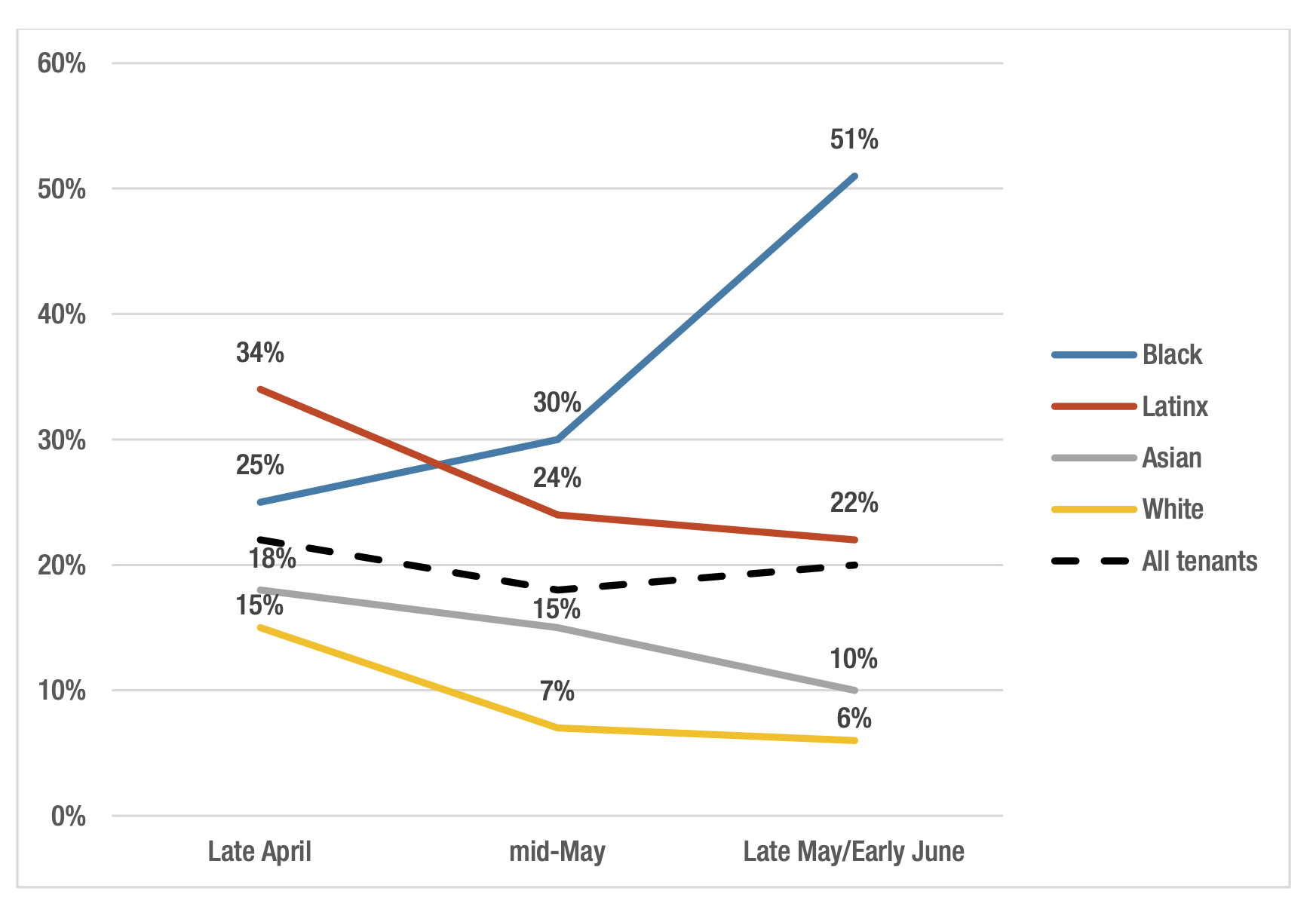 Figure 3. Half of Black tenant households in New York State fell behind on their rent as of late May/early June 2020.