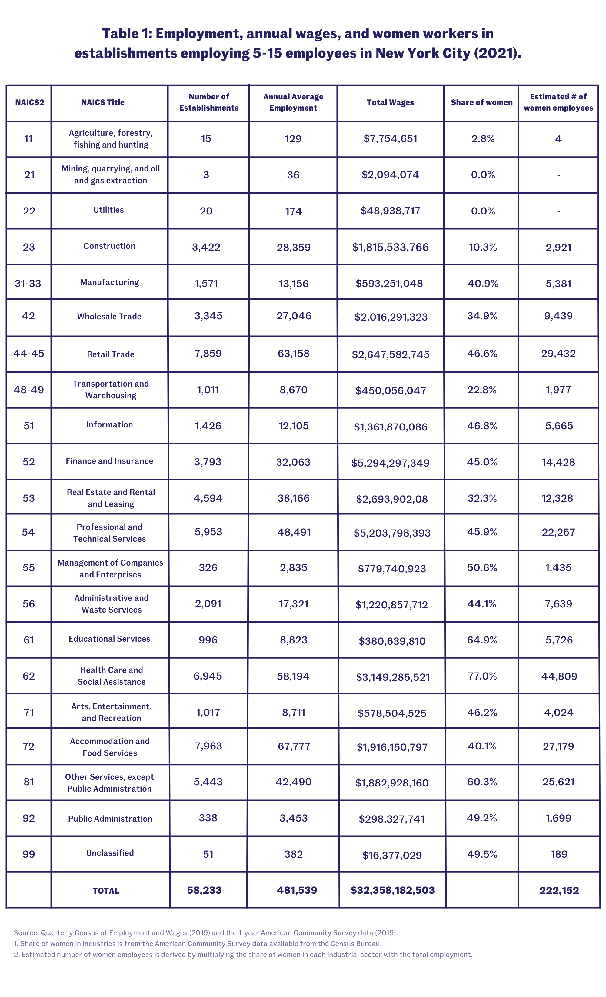 Intr. 0134 seeks to exclude employers with 5 to 15 employees from declaring the salary range when they post jobs. In the name of helping struggling businesses, the current bill is impeding progress towards pay parity. There are about 58,000 of these businesses, per data from the New York State’s Department of Labor. Table 1 provides a detailed decomposition of these businesses across industrial sectors. These businesses employ around half a million workers and have an average annual payroll of $550,000. Although a majority (45 percent) of these businesses are in Manhattan, both Queens and Brooklyn have approximately 12,000 and 14,000 establishments that would now be exempt.[2] By excluding these businesses, the city would imperil over 222,000 women workers, who would, once again have to apply for jobs without any idea about salary. This bill takes us several steps back from leveling the playing field for women and other marginalized workers.