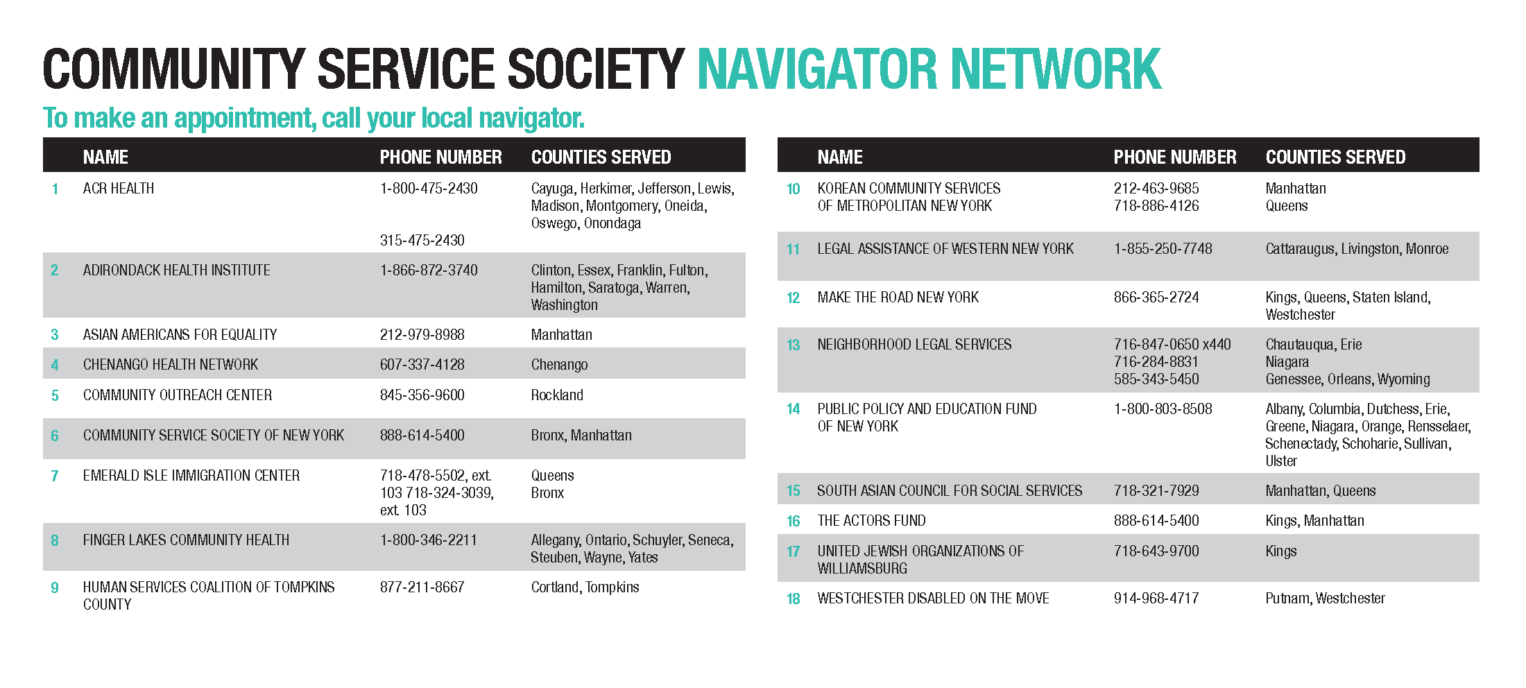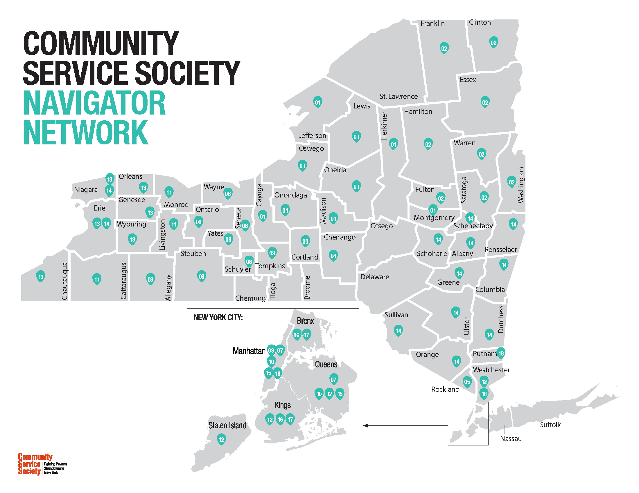 | Community Service Society of New York | 888-614-5400 | Bronx, Manhattan |